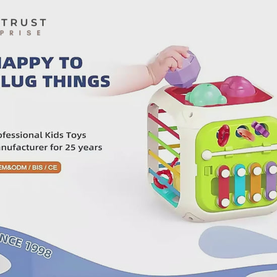 One toy, endless fun! This activity cube combines 7 engaging activities β shape sorter, pull strings, sensory box, bead maze, musical xylophone, spinning gears, and stacking blocks β keeping little ones entertained while boosting brain development.